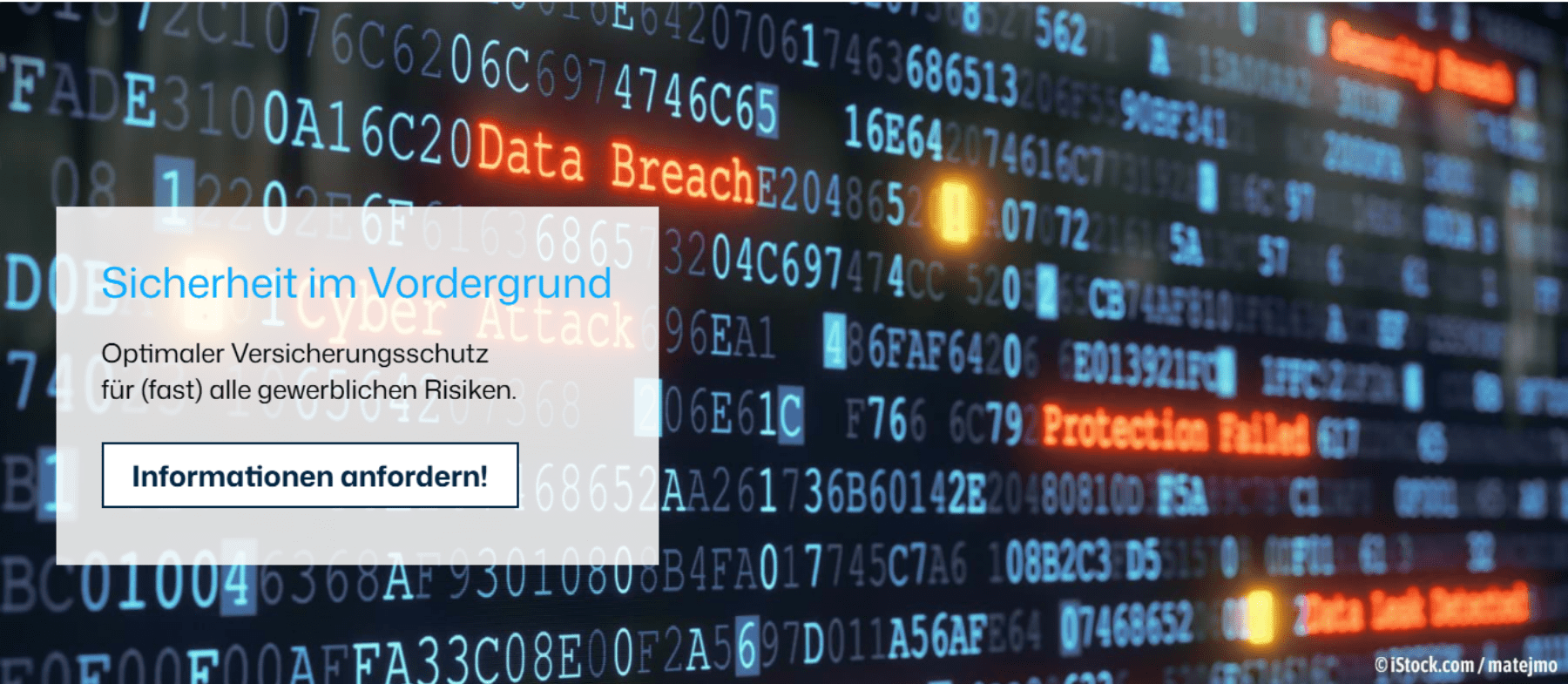 Was Angriffe nicht verhindert, aber die negativen Folgen ganz erheblich mindert, ist eine Cyber-Versicherung. Sie steht Ihnen im Worst Case mit einer 24-Stunden-Cyber-Soforthilfe, Wiederherstellung der Systeme, Hilfe bei der Krisenkommunikation, Schadenersatz und vielem mehr zur Seite.